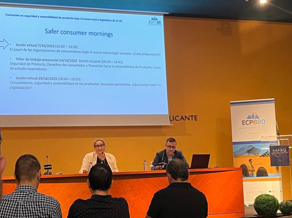 Esta jornada, dirigida a técnicos de organizaciones de consumidores y otros profesionales vinculados a la educación de las personas consumidoras, tuvo como objetivo principal reforzar sus competencias ante los retos del nuevo marco legislativo europeo en materia de seguridad de producto y sostenibilidad.